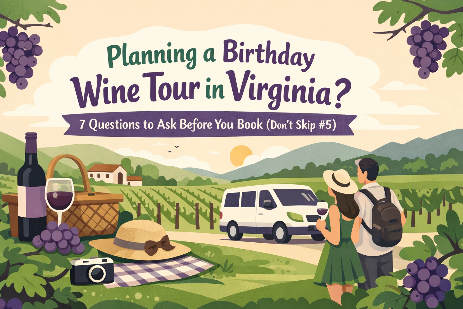 Planning a Birthday Wine Tour in Virginia? 7 Questions to Ask Before You Book (Don't Skip #5) admin February 9, 2026 So your best friend is turning another year wiser (we don't say "older" anymore), and you're in charge of making